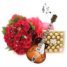 red rosses wrapped in bright red net paper  is the cutest way to say i love you. this hamper include 40 red roses wrapped in red net paper and tied with red ribbon. pack of ferrero rocher our proffetional guitarist wil add the munch nedded rhythmic fascination.