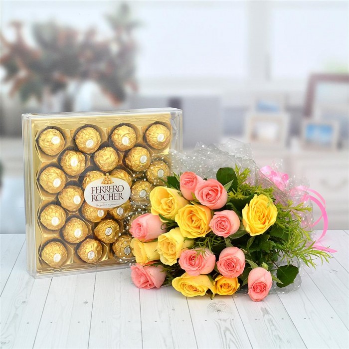 This striking mix bouquet of roses is a traditional presentation to gift someone when you are trying to express your gratitude. This exclusive gift hamper arrives with delicious Ferrero Rocher chocolate that makes this combo even more tempting. Delight your loved ones with this gift bonanza.