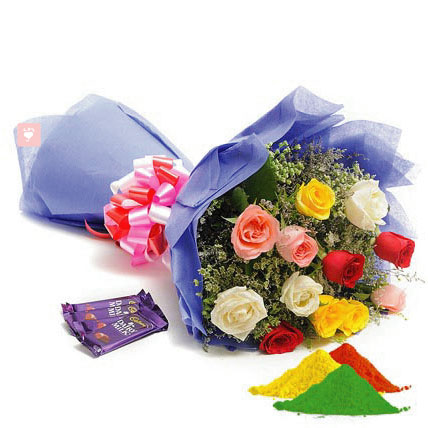 Enjoy the Blast colours with these Mixed coloured roses and delicious 4 Cadbury dairy milk chocolates of 14 gms each. A nice bunch of 12 long stem mix colour roses & small packs of Gulal. The aroma of the flowers will lift your mood and refresh your room also will relax you.
