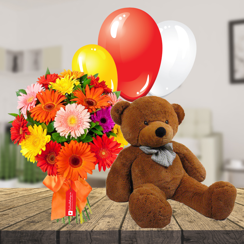 Here is an exciting gift hamper, comprising of Mixed Flowers, 6 inch Teddy bear and 10 Pcs ballons. Gifting mixed roses to someone is a symbol of gratitude and appreciation, and is also a traditional way to say 'thanks'. On the other hand, white teddy bear will convey a message, 'how special that person is in your life'. So, this combination of a bouquet of mixed flowers and a teddy bear will act as the best gift for a loved one. In fact, there is no better way than this to express your feelings to someone. Place your order right away!