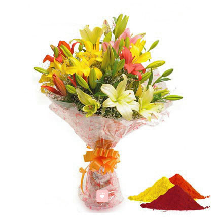Surprise someone special with this colorful bunch of flowers and celebrate a moment of love together. This is an arrangement of 12 lilies with Gulal.