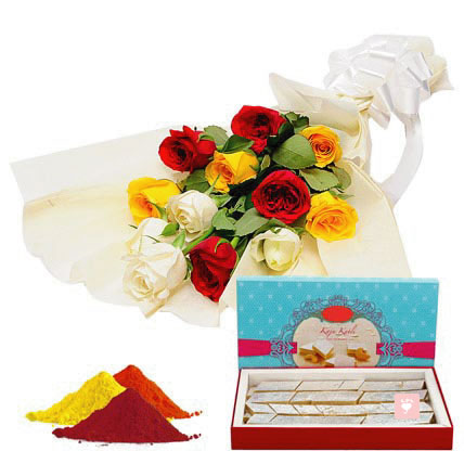 Bunch of 4 12 Mixed roses in paper packing and 500gm Kaju Katli Sweet from Good Confectionery & small packs Gulal.
