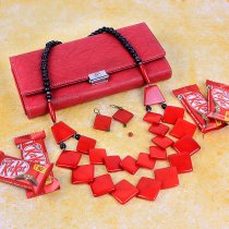 1red statement with pair of earrings and 1 red clutch bag