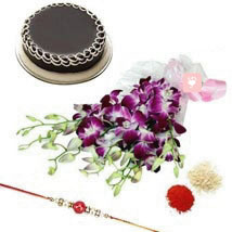 6 purple orchids flowers with 500gm chocolate cake & Rakhi with roli chawal.
