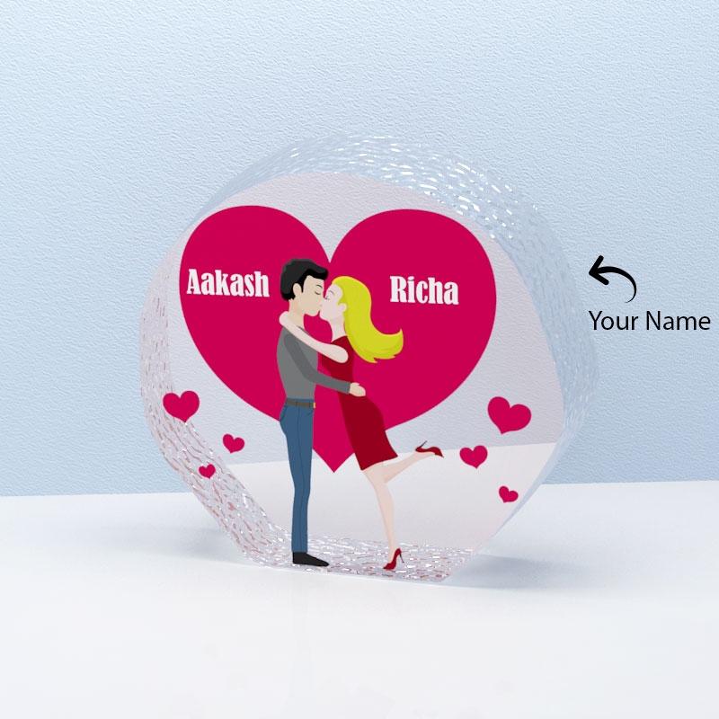 Add spark to your relation with your partner by presenting her or him a lovely surprise of this crystal that we have here. It is a crystal, round in shape and ready to be personalized with names. With the print of one heart, hot pink in colour and a couple sharing love filled moments, the crystal is best to express your emotions. Place an order for this customized crystal to surprise your partner or make use to it to elate any couple you love to see smiling. Required product details mentioned below: 3 inch round shape crystal personalized with 2 names.