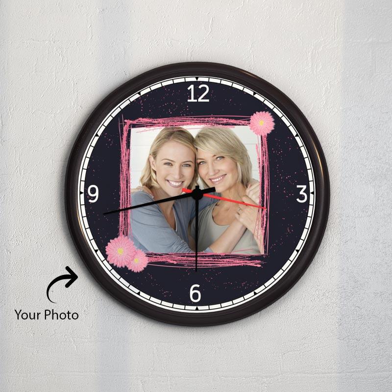 This gift item is bound to bag appreciation from the receiver. It is a wall clock which is very beautifully crafted. This wall clock is round shape and is available in dark blue color. Border of this wall clock is colored in black. Dotted design inside the dial makes this wall clock look very attractive. This wall clock is available with photo personalization facility. Photo will appear on the centre of this wall clock after personalization. Photo will be inscribed on the centre surface of this wall with pink borders and three pink flowers. Use the favorite photo of your mom to personalize this wall clock. So go ahead, place your order now. Product Details: 10x10 Inches Round Shape Wooden Framed Clock, personalized with one photo