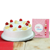 If you want to some creamy cake with mouth watering, this is suitable in all of the cake. The design of this cake is round and topping with cheery on the top this looks make the cake more delicious. This hamper includes pineapple cake along with Rakhi and greeting cards.
