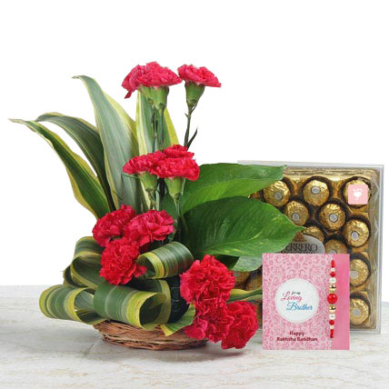 Filled with a fragrance of love, this breath taking the beauty of Carnationss arrangement will definitely catch your attention. Paired with a beautiful rakhi and a delectable box of chocolate, it will surely melt the heart of your brother. Your Gift Contains:
