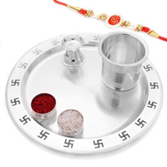 A High-Quality Silver Plated Thali Set comprising of a Thali, A diya, two containers for tikka and chawal, and a glass all in best quality silver plating making it an ideal gifting solution.Size:9". This comes with a traditional Rakhi traditionally designed with beads and stones to make it unique in its own way.The same rakhi would be sent as shown in the image, but if some last minute shortage arises, something similar would be sent. Free Roli Chawal go along with this product.