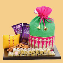 This pair of Rudraksha rakhi accompanied by beads is a classic symbol of elegance and style. Bestowing all your wishes on this Rakshabandhan by sending this combo of sweets, chocolates and almonds. This festive season makes the most of it and finds complimentary Roli and Chawal as it adds auspiciousness to the occasion. Your Gift Contains: