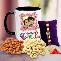 Celebrate a raksha bandhan fastivals your brother surprise him with this unique gift hamper. This hamper include of 100 gms cashews, 100 gms almonds, personalised photo mug, a traditional rakhi, roli chawal and greeting card