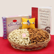 Celebrate this Rakhi festival full of joy with this hamper which has designar rakhi with greeting card, soan papdi and dry fruits to make your Rakhi festival a memorable one