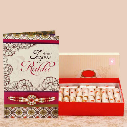 This box of Kaju rolls by is good to add charm and bring taste to the celebrations. Along with it comes this beautiful greeting card and rakhi which will convey all your deepest emotions to your brother. Order this lovely gift and enjoy the same day delivery. You gift contains: