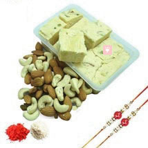 Send to your brothers with the delicious soan papdi and crunchy dry fruits on this Rakhi. This is a combo of One Pack of Soan Papdi of 250 grams, Cashews & Almonds of 100 grams each and Two Rakhis with Roli Chawal. The designs of rakhis may vary, as per the availability at the time of delivery. Your Gift Contains: