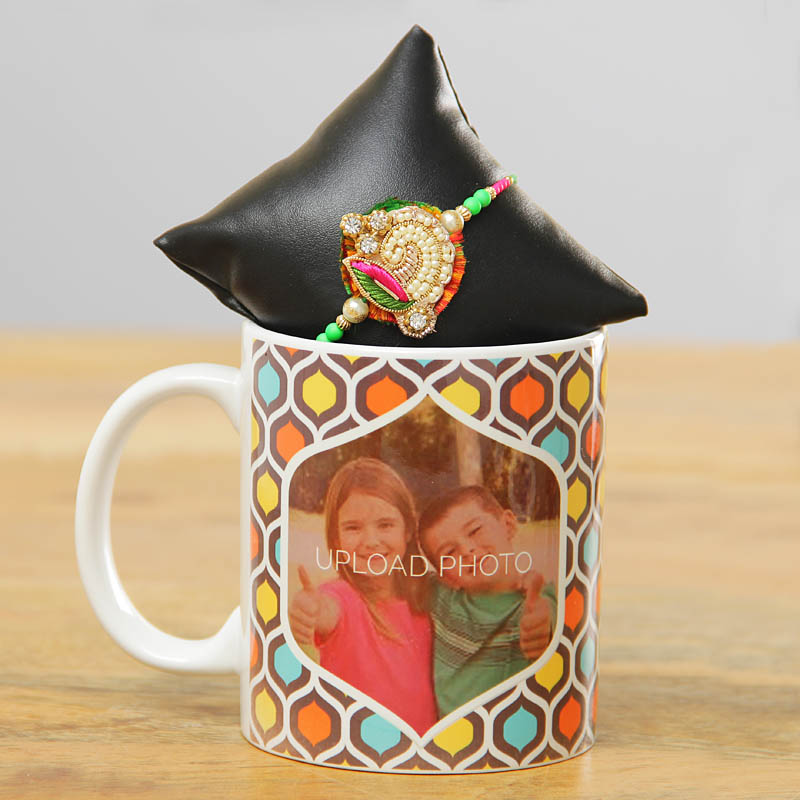 Upload a high-resolution image of your best memory while ordering the combo. The background of the mug has a very nice and quirky design that adds to its appeal. Product details: Rakhi with white ceramic mug personalized with one photo. The cushion is only for curation.