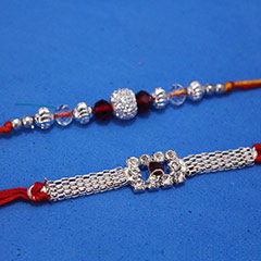 One of these two Rakhis is crafted with Silver, Red and transparent beads and the other one is Stone Studded Silver Rakhi that can be worn as a Bracelet. (Roli and Chawal included)