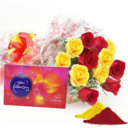 This Rango Ka Tyohar, delight your special someone with amazing gift hamper that comprises of a bunch of 10 Red and Yellow Roses ,box of cadbury celebration pack of 100 grams with 2 small packs of Gulal.