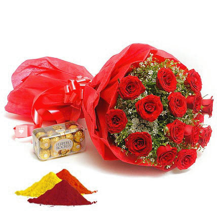 This combo from onlinedelivery has a box of16 pcs Ferrero Rocher chocolates and a bunch of 15 long-stemmed red roses with small packs of Gulal.