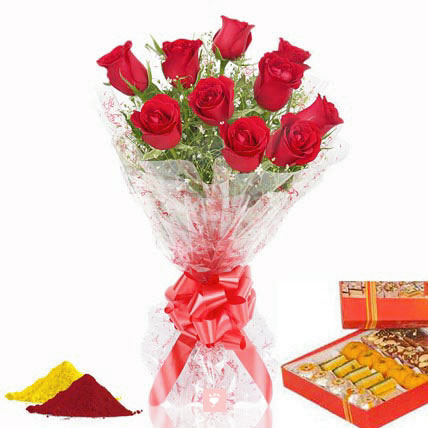 Wish your loved ones colorful and very Happy Holi with Assorted sweets, bunch of 12 red roses and small packets of gulal.