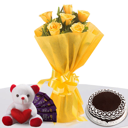 A perfect combo gift consisting of yellow roses, chocolate cake, Cadbury, and a soft toy would make anyone happy. So, for your next special day, you can have this set of gift that would make the day a memorable one.