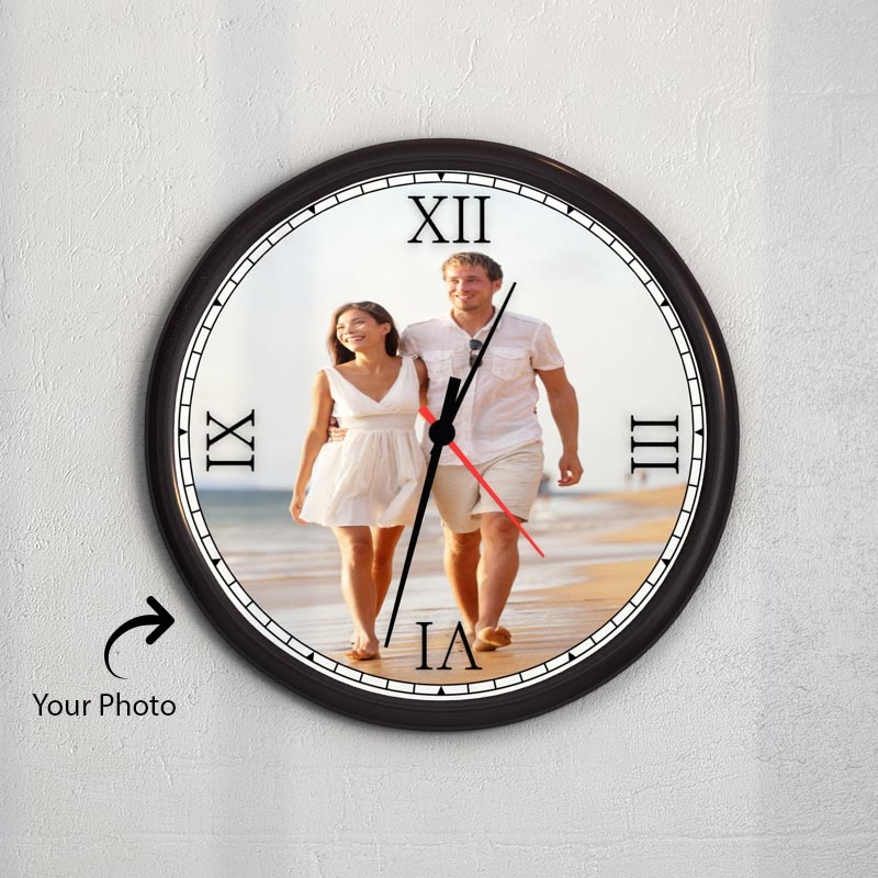 Gift your love a wooden round shape analogue clock with a personalized photo printed on it this Valentine s Day. The wooden base of the watch with black colour tone will suit with all kinds colour and texture of the wall. The image printed on the clock is covered all over on the background which looks amazing. The colour combination of the hands of the clock suits well with the background image giving it a special look. This watch will be cherished for her entire life when she will see it. Product Detail: Round wooden framed clock with one photo