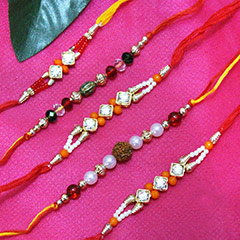 Product details:- set of 5 Rakhis having 1 Rudraksha Pearl Rakhi, 1 colourfully Beaded Rakhi and 3 Stone Studded Beaded Rakhis having beautiful orange and red beads that are sure to win hearts over. (Roli and Chawal Included)