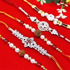 Your product contains- set of 5 Rakhis that has 2 Rudraksha Pearl Rakhis, 1 Designer Black Beaded Rakhi alongside with 2 Silver Stone studded Rakhis with one having a Swastika in between. (Roli and Chawal Included)