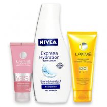 A thoughtful gift for bringing smiles on the face of the special Woman/Girl in your life, this hamper consists of One Nivea body lotion 250 ml, One Lakme sunscreen with spf 30 protection 50ml and One Lakme clean up face wash for that rejuvenating experience.