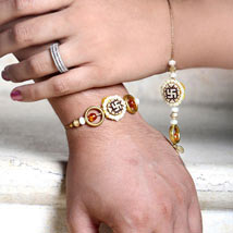 Celebrate a Raksha Bandhan with your Bhaiyya and Bhabhi. This Swastik designed Lumba rakhi set makes your bhayiaa bhabhi day.