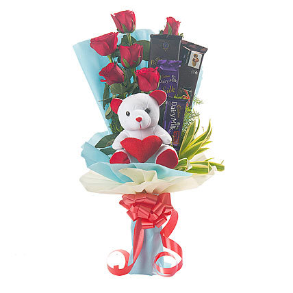 There is no better way to celebrate any occasion than with this Lovely arrangement of chocolates, Flower,Teddy Bear. As chocolates are loved by people of all age, you can easily give this gift to your loved ones. Along with chocolates, roses and teddy bear is also present to add more excitement