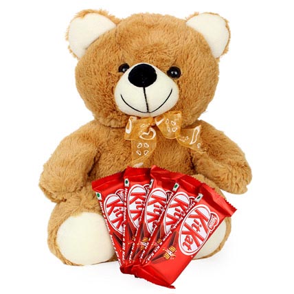 Hearty confessions made with this attractive and adorable teddy and Chocolates is sure to take your beloved off the floor This is a duo of One Light Brown Teddy of 13 in size, along with Five Kit-Kat Chocolates of 16 grams each.