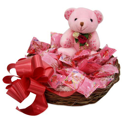 Get home a hamper filled with taste and fun. Present your loved one with a hamper 150 grams of Corazon strawberry candies and a 6 inches cute pink teddy bear in a beautiful basket.