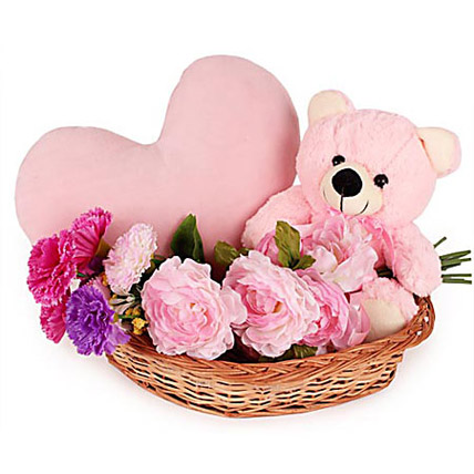 The best and most beautiful things in the world cannot be seen or even touched. They must be felt with the heart. So make your dear ones feel special by gifting them a small token of love from us. Get an amazing hamper of 10 inches Teddy along with 2 bunches of 5 artificial carnations each and 12 inch pink heart shaped cushion beautifully placed in a basket.