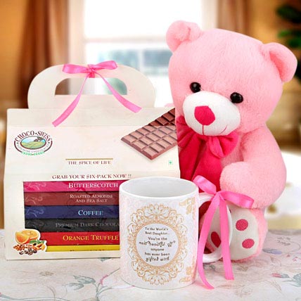 Make your daughter feel special as always, by presenting her this sweet and cute combo. Gift her this captivating combo of a printed Coffee Mug, Chocolates and a Teddy to tell her what she means to you.