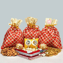 Dry fruits gifts hamper. Teamed with dry fruits and a golden box of roli chawal, the beauty of this super beautiful combo will surely bring verve to your celebration this year. Your Gift Contains: