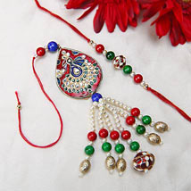 Lumba Rakhi with an engraved peacock and red, green and white rakhi set