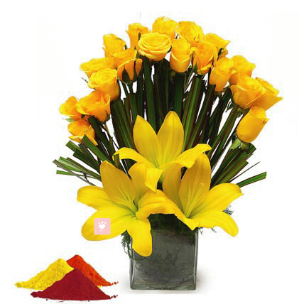 Initating of happiness in your life with this combo of yellow Lily with yellow roses to dearest ones and realize him/her special. On holy day of holi spreads happiness in color of gulal bouquet of flower. It consists of 20 yellow roses, 2 lilies waith vase and red gulal.