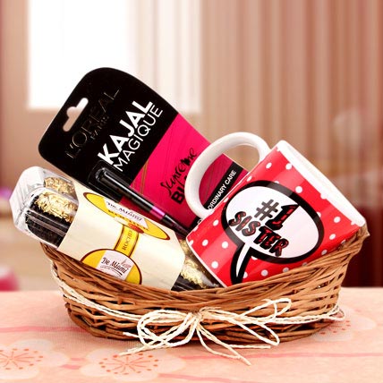 A complete package which will bring sparkle in your sister's eyes. Send her this beauty basket comprising of coffee mug, kajal and chocolates and make her feel special. Your Gift Contains: